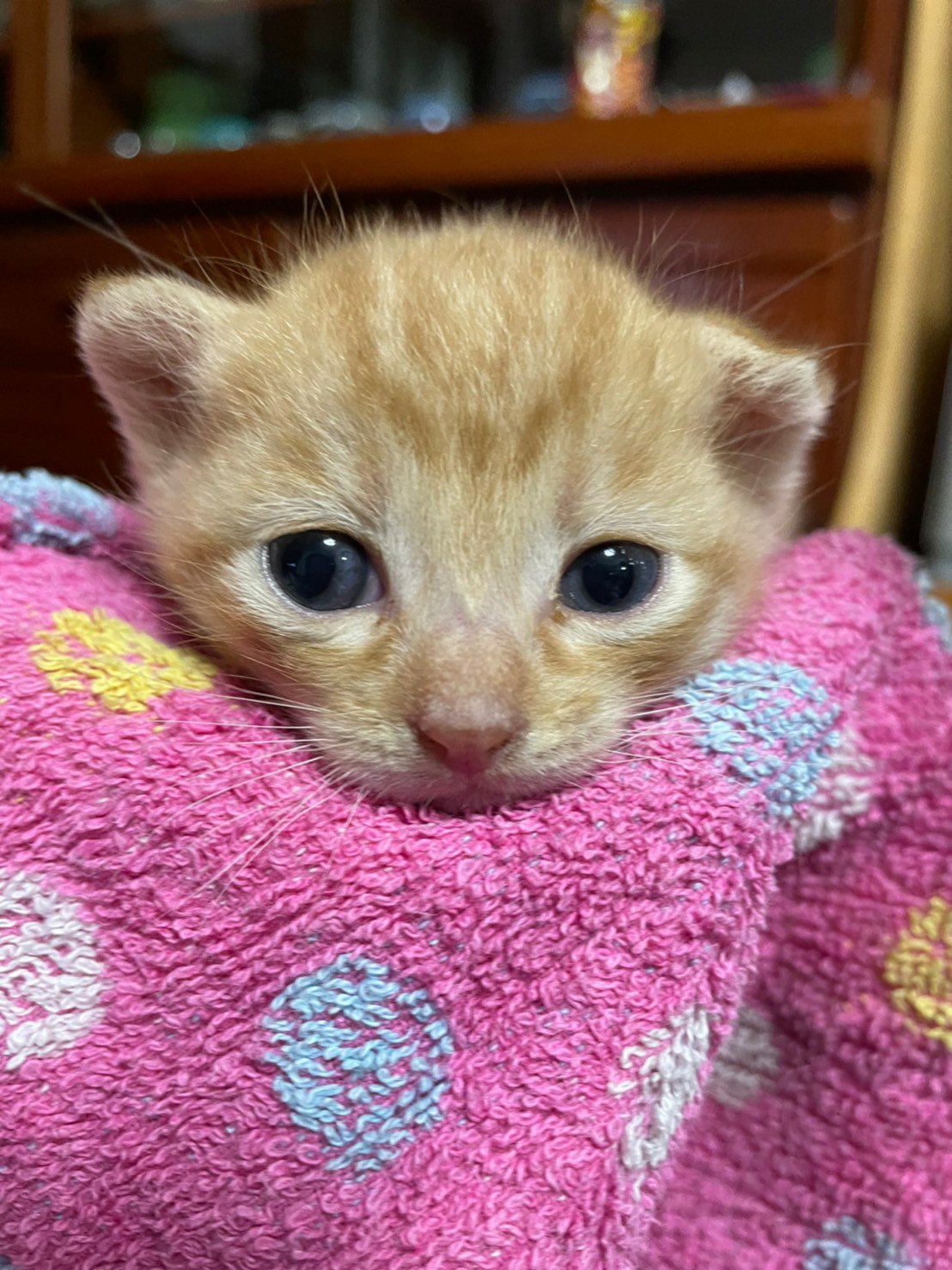 ぼくは、子迫電工の事務所に毎朝、おかあさんと一緒に出勤してきます。事務員さんもいますが、快くむかえてくれます。ぼくは多分近くの農業用倉庫で生まれました。人間に見つかり、ぼくだけが放り出されました。ママは迎えに来てくれませんでした。ぼくは、ひとりぼっちになりました。もうすぐ、夜がやってこようとしたとき、おかあさんとちーちゃんがぼくを家に連れて帰ってくれました。そして、哺乳瓶でミルクをぼくに与えてくれました。